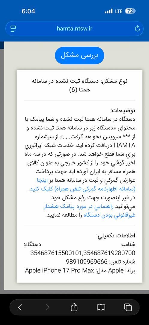 شماره IMEI دستگاه را در سایت همتا بررسی کنید تا از وضعیت رجیستری مطمئن شوید.